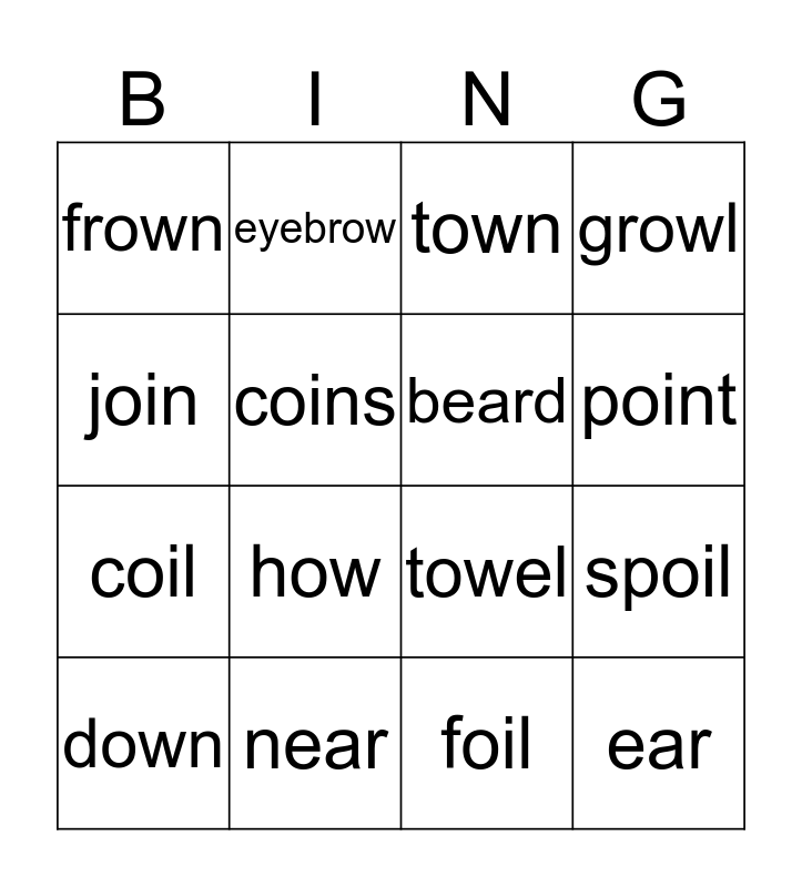 This bingo card has 18 words: how, ear, town, frown, towel, growl, down, eyebrow, point, coil, foil, join, spoil, coins, beard, earring, near and fear.