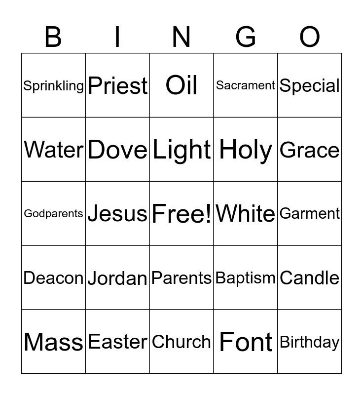 This bingo card has a free space and 27 words: Baptism, Promises, Holy, Church, Water, Oil, Priest, Deacon, White, Candle, Godparents, Sacrament, Mass, Easter, Grace, John, Dove, Light, Jordan, Sprinkling, Garment, Font, Jesus, Birthday, Parents, Special and Easter.