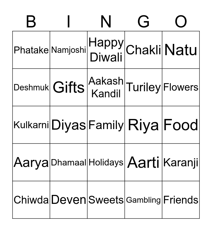This bingo card has 30 words: Deven, Rangoli, Diyas, Lights, Phatake, Happy Diwali, Gifts, Holidays, Riya, Sweets, Food, Family, Gambling, Friends, Flowers, Puja, Aarti, Aarya, Dhamaal, Natu, Kulkarni, Mankame, Namjoshi, Turiley, Deshmuk, Chakli, Karanji, Chiwda, Aakash Kandil and Killa.