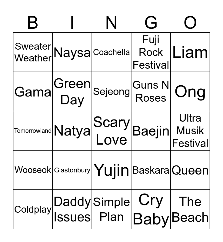 This bingo card has a free space and 24 words: Coldplay, Glastonbury, Sejeong, Cry Baby, Liam, Sweater Weather, Naysa, Coachella, Baejin, Ultra Musik Festival, Tomorrowland, Green Day, Baskara, Queen, Gama, Daddy Issues, Simple Plan, Fuji Rock Festival, Ong, Wooseok, Natya, Yujin, Guns N Roses and The Beach.
