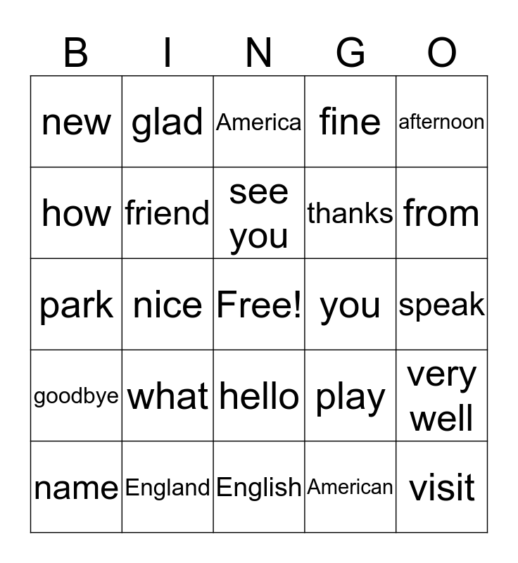 This bingo card has a free space and 29 words: name, meet, nice, morning, new, America, friend, what, you, England, speak, visit, English, American, from, where, hello, goodbye, afternoon, park, play, tomorrow, thanks, how, fine, glad, very well, see you and chess.