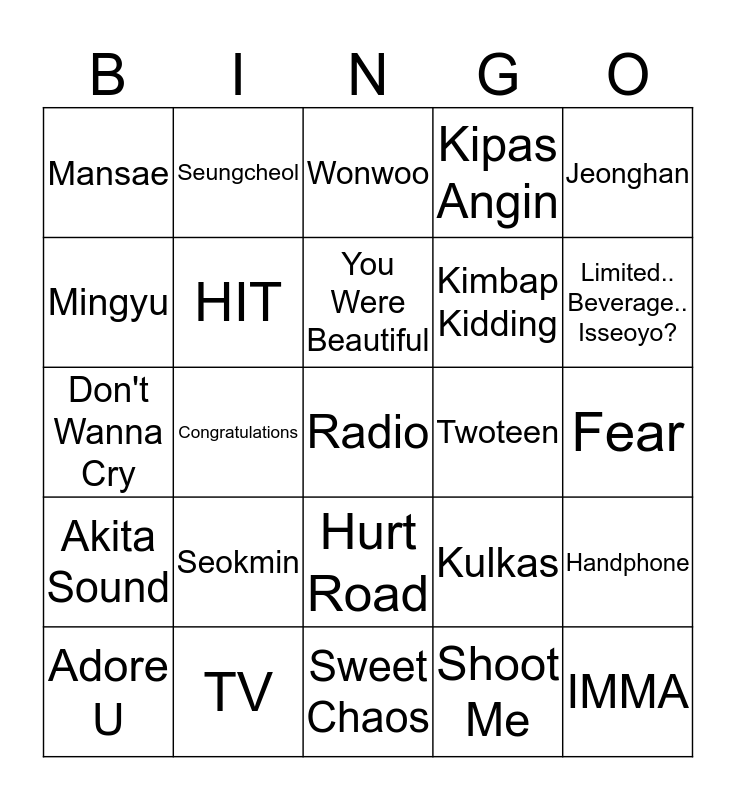 This bingo card has a free space and 24 words: Seokmin, TV, You Were Beautiful, Adore U, Jeonghan, Mansae, Mingyu, Seungcheol, Twoteen, Hurt Road, Kimbap Kidding, Don't Wanna Cry, Kulkas, Handphone, HIT, Shoot Me, Fear, Wonwoo, Limited.. Beverage.. Isseoyo?, Congratulations, IMMA, Akita Sound, Kipas Angin and Sweet Chaos.