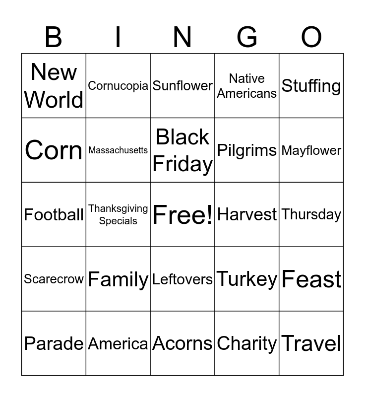 This bingo card has a free space and 27 words: Turkey, Pie, Pilgrims, Acorns, Corn, Sunflower, Cornucopia, Scarecrow, Harvest, Feast, Football, Native Americans, Parade, America, Mayflower, Thankful, Massachusetts, Black Friday, Family, New World, Thursday, Charity, Thanksgiving Specials, Travel, Leftovers, Stuffing and Around the World.