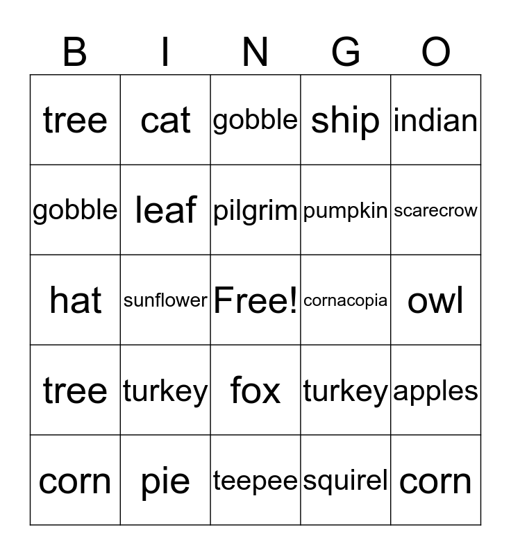 This bingo card has a free space and 24 words: turkey, pie, pilgrim, corn, indian, tree, gobble, cat, cornacopia, fox, pumpkin, hat, turkey, apples, leaf, squirel, owl, gobble, scarecrow, sunflower, corn, tree, ship and teepee.