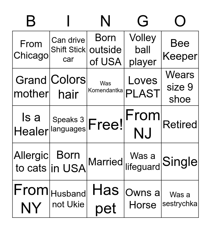 This bingo card has a free space and 34 words: Has Tattoo, Only Child, Married Deb. date, Has knee implants, Retired, Grand mother, Colors hair, Has pet, Loves PLAST, Was a sestrychka, Is a Healer, Can drive Shift Stick car, Owns a Horse, Was Miss Soyuzivka, Allergic to cats, Speaks 3 languages, Married, From NJ, Single, From NY, Husband not Ukie, Did "Matura", Volley ball player, Wears size 9 shoe, From CT, Born in USA, Born outside of USA, Has Green Eyes, Bee Keeper, From Chicago, Worked in Retail store, Was Komendantka, Was a lifeguard and Traveled to Ukraine.