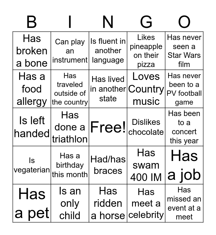 This bingo card has a free space and 24 words: Has a birthday this month, Is an only child, Has lived in another state, Has a pet, Has never seen a Star Wars film, Has broken a bone, Has a food allergy, Can play an instrument, Dislikes chocolate, Had/has braces, Loves Country music, Is left handed, Has swam 400 IM, Has a job, Has traveled outside of the country, Has meet a celebrity, Has been to a concert this year, Is fluent in another language, Has never been to a PV football game, Has done a triathlon, Has missed an event at a meet, Is vegaterian, Likes pineapple on their pizza and Has ridden a horse.