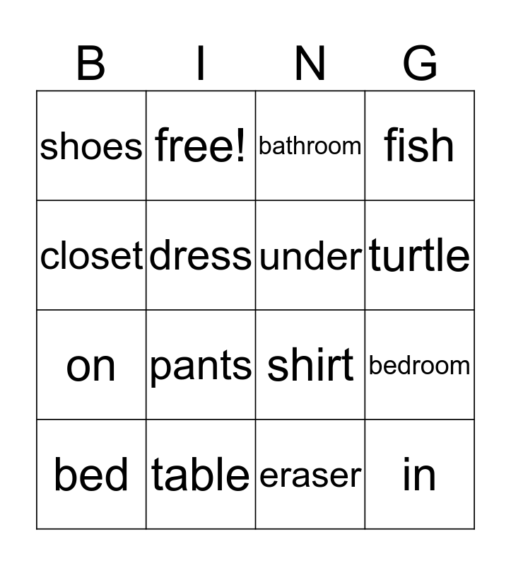 This bingo card has 20 words: bedroom, kitchen, bathroom, living room, bed, closet, table, shoes, on, free!, pants, shirt, dress, in, under, desk, turtle, fish, eraser and guitar.