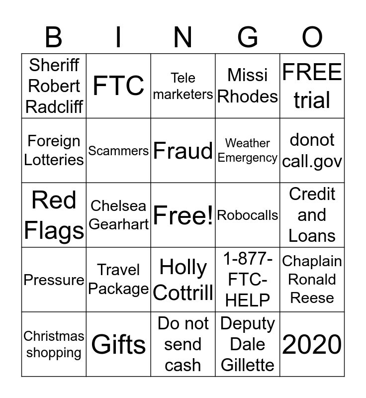 This bingo card has a free space and 34 words: JESUS is reason for the Season, Deputy Dale Gillette, Car warranties, How to file a complaint, Pressure, Scammers, FREE trial, Christmas shopping, FTC, Senior Center, Fraud, Tele marketers, Phone scams, Free gift, Robocalls, donot call.gov, Gifts, Red Flags, Travel Package, 1-877-FTC-HELP, Holly Cottrill, Business Investment, Sheriff Robert Radcliff, Credit and Loans, Do not send cash, 2020, Missi Rhodes, Pumpkin Show, Weather Emergency, Foreign Lotteries, Charity Fraud, Chelsea Gearhart, Chaplain Ronald Reese and Kingston National Bank.
