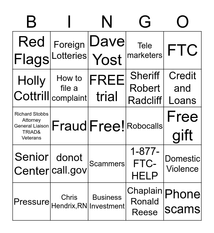 This bingo card has a free space and 39 words: JESUS is reason for the Season, Deputy Dale Gillette, Car warranties, How to file a complaint, Pressure, Scammers, FREE trial, Christmas shopping, FTC, Senior Center, Fraud, Tele marketers, Phone scams, Free gift, Robocalls, donot call.gov, Gifts, Red Flags, Travel Package, 1-877-FTC-HELP, Holly Cottrill, Business Investment, Sheriff Robert Radcliff, Credit and Loans, Do not send cash, Watch Video consumer. ftc.gov/ media, Missi Rhodes, Pumpkin Show, Weather Emergency, Foreign Lotteries, Charity Fraud, Chelsea Gearhart, Dave Yost, Chris Hendrix,RN, Chaplain Ronald Reese, Keep car doors locked, Domestic Violence, Richard Stobbs Attorney General Liaison TRIAD& Veterans and Ohio Chistian Unversity.