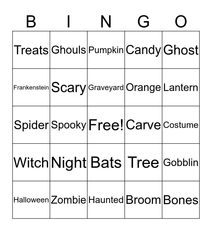 This bingo card has a free space and 29 words: Halloween, Trick, Spooky, Monster, Treats, Pumpkin, Scary, Night, Carve, Zombie, Costume, Bones, Haunted, Broom, Lantern, Scarecrow, Bats, Witch, Ghost, Spider, Tree, Crow, Orange, Frankenstein, Candy, Ghouls, Gobblin, Graveyard and Vampire.