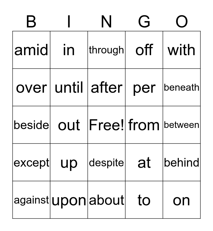This bingo card has a free space and 45 words: of, on, under, against, toward, to, through, within, with, upon, off, from, despite, up, as, about, along, beside, down, beneath, in, above, across, amid, before, between, during, inside, at, except, into, behind, beyond, among, for, out, by, below, around, after, over, per, since, until and without.