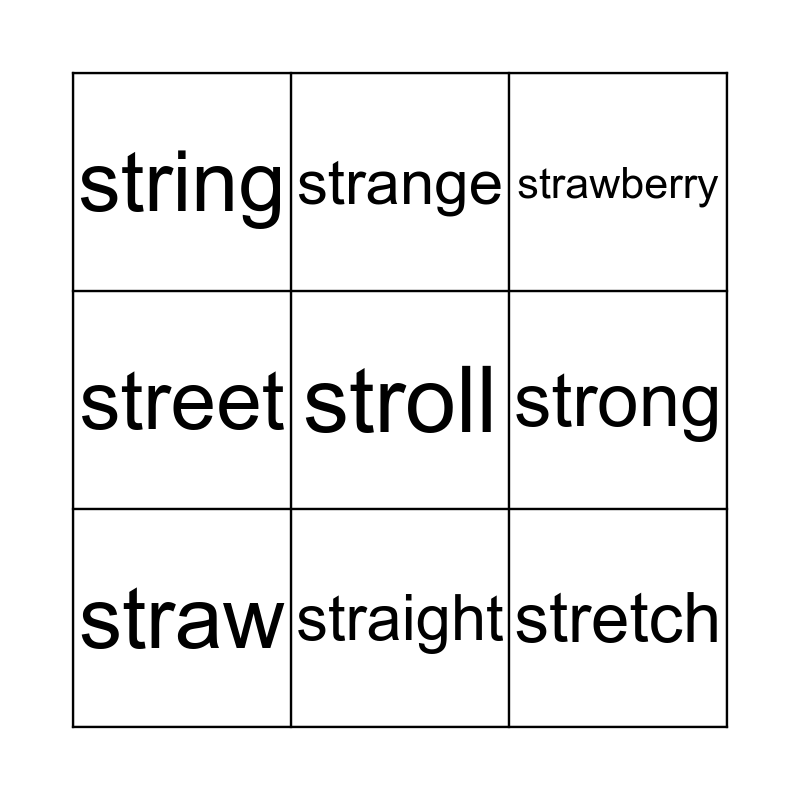This bingo card has 9 words: straw, strawberry, strange, street, string, strong, stroll, stretch and straight.