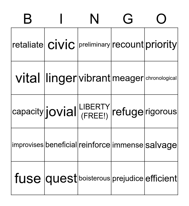 This bingo card has a free space and 45 words: accumulate, efficient, elaborate, fuse, futile, prejudice, preliminary, primitive, priority, quest, recount, refuge, reinforce, beneficial, blunder, boisterous, campaign, capacity, capital, chronological, civic, hoax, hostile, retaliate, retrieve, rigorous, rural, ignite, immense, improvises, inept, salvage, sanctuary, siege, significant, jovial, knack, monotonous, tangible, vibrant, vital, meager, terrain, linger and diligent.