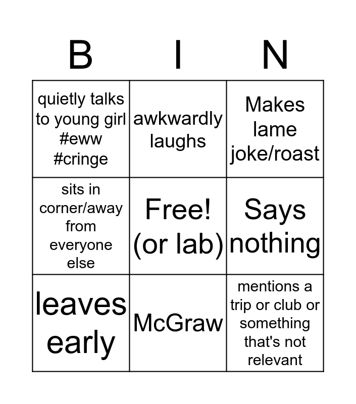 This bingo card has a free space and 8 words: Says nothing, Makes lame joke/roast, awkwardly laughs, leaves early, quietly talks to young girl #eww #cringe, mentions a trip or club or something that's not relevant, sits in corner/away from everyone else and McGraw.