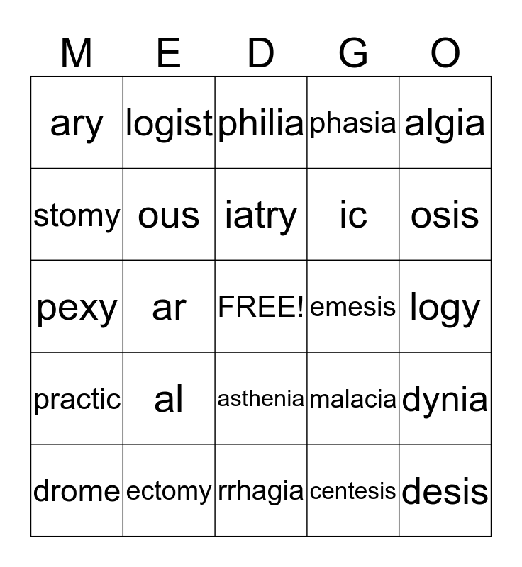This bingo card has a free space and 24 words: al, ectomy, iatry, drome, algia, ary, stomy, logist, emesis, asthenia, ic, pexy, malacia, dynia, ous, centesis, logy, philia, osis, ar, desis, practic, phasia and rrhagia.