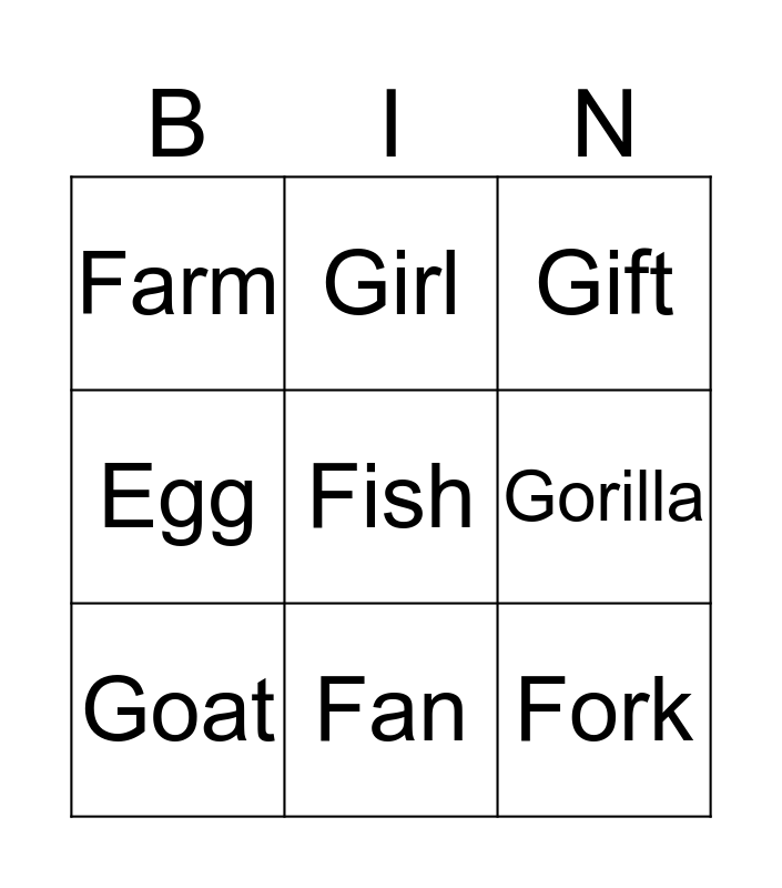 This bingo card has a free space and 8 words: Gorilla, Gift, Girl, Goat, Farm, Fork, Egg and Fan.