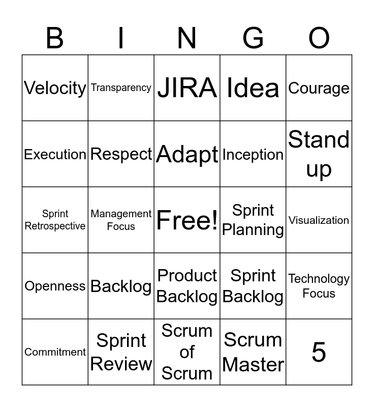 This bingo card has a free space and 34 words: Product Owner, Scrum Master, Development Team, Focus, Openness, Respect, Courage, Commitment, Transparency, Inspect, Adapt, JIRA, Scrum Board, Grooming, Sprint Planning, Stand up, Sprint Review, Sprint Retrospective, Backlog, Sprint Backlog, Product Backlog, Happiness Index, Velocity, Visualization, Scrum of Scrum, 5, Idea, Discovery, Inception, Execution, Embed, Management Focus, Technology Focus and Solution Focus.