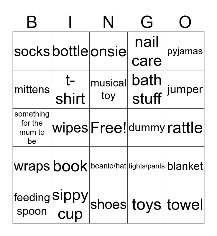 This bingo card has a free space and 31 words: shoes, nappies, wipes, singlets, socks, onsie, t-shirt, tights/pants, dummy, toys, rattle, towel, face washer, bibs, jumper, burping cloths, blanket, book, wraps, beanie/hat, pyjamas, photo frame, feeding spoon, bottle, bath stuff, mittens, nail care, something for the mum to be, sippy cup, musical toy and baby powder.