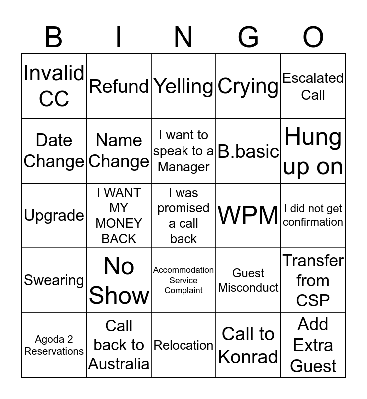 This bingo card has 25 words: No Show, Relocation, I want to speak to a Manager, Agoda 2 Reservations, Escalated Call, Invalid CC, Date Change, Refund, WPM, Accommodation Service Complaint, B.basic, Upgrade, Guest Misconduct, Transfer from CSP, Name Change, Add Extra Guest, I did not get confirmation, Yelling, Hung up on, I WANT MY MONEY BACK, I was promised a call back, Call back to Australia, Swearing, Crying and Call to Konrad.