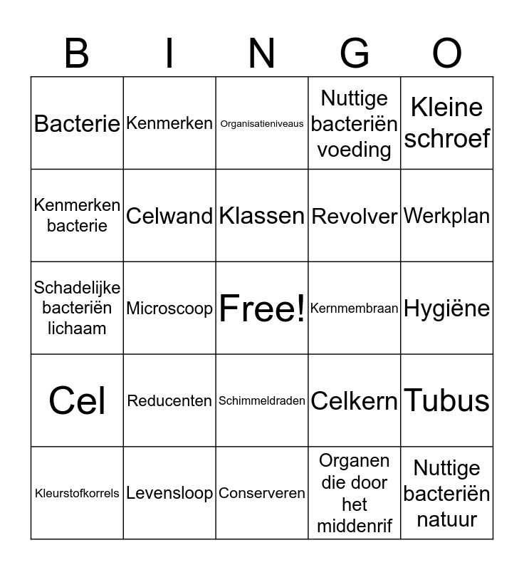 This bingo card has a free space and 73 words: Antibiotica, Deling, Bacterie, Diafragma, Bladgroenkorrels, Dierlijke cel, Cel, Eencellige, Celkern, Gisten, Celmembraan, Grote schroef, Celwand, Hygiëne, Conclusie, Kenmerken, Conserveren, Kenmerken bacterie, Cytoplasma, Kernmembraan, Klassen, Nuttige bacteriën voeding, Kleine schroef, Nuttige schimmels gezondheid, Kleurstofkorrels, Nuttige schimmels natuur, Levenscyclus, Nuttige schimmels voeding, Levenskenmerken, Objectief, Levensloop, Oculair, Meercellige, Ontwikkeling, Microscoop, Ordening, Middenrif, Orgaan, Nuttige bacteriën natuur, Orgaanstelsel, Organen die door het middenrif, Reducenten, Organen in de borstholte, Resultaten, Organen in de buikholte, Revolver, Organisatieniveaus, Rijken, Organismen, Schadelijke bacteriën lichaam, Paddenstoel, Schadelijke bacteriën voeding, Penicilline, Schadelijke schimmels lichaam, Plantaardige cel, Schadelijke schimmels voeding, Preparaatklemmen, Schimmeldraden, Probleemstelling, Schimmels, Soorten, Weefsel, Sporen, Werkplan, Stammen, Zetmeelkorrels, Statief, Tafel, Tubus, Tussencelstof, Vacuole, Verwachting and Voortplanting van een bacterie.