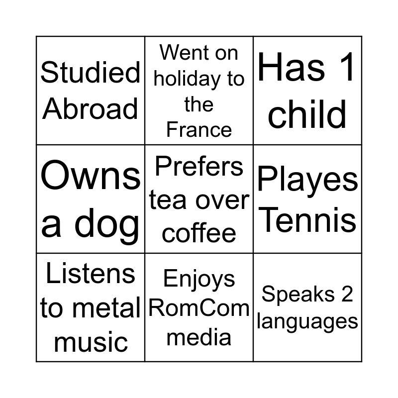 This bingo card has 9 words: Listens to metal music, Has 1 child, Went on holiday to the France, Owns a dog, Studied Abroad, Playes Tennis, Prefers tea over coffee, Speaks 2 languages and Enjoys RomCom media.
