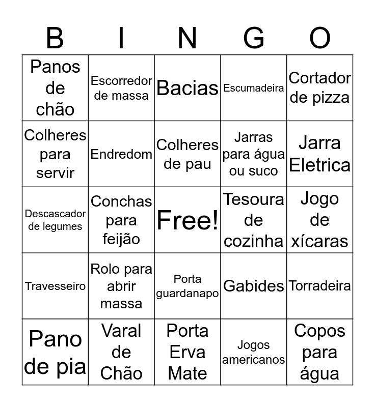 This bingo card has a free space and 77 words: Abridor de lata, Açucareiro, Bacias, Balde de Gelo, Balde, Batedor manual/Fouet, Cadeira de Praia, Cafeteira Elétrica, Tapete de porta, Cestinho para prendedor de roupa, Chaleira, Colher de silicone, Colheres de pau, Colheres para servir, Concha para sorvete, Conchas para feijão, Conchas para sopa, Copos para água, Copos para cerveja, Cortador de pizza, Descansos de panela, Descascador de legumes, Endredom, Escorredor de massa, Escumadeira, Espatula de silicone, Ferro de passar roupa, Forma para pizza, Forma para pudim, Forma quadrada (assadeira), Formas de gelo, Formas para bolo redonda, Frigideira, Gabides, Jarra Eletrica, Jarras para água ou suco, Tapete de Banheiro, Jogo de Lençol, Jogo de xícaras, Jogos americanos, Kit de Banheiro, Vassoura, Pá de lixo, Marinex de vidro, Martelo de carne, Panela de pressão, Pano de pia, Panos de chão, Panos de prato, Pegador de massa, Pegador de salada, Porta guardanapo, Porta temperos, Potes plásticos multiuso, Pratos fundos, Pratos rasos, Prendedor de Roupa, Prendedor para fechar Mantimentos, Ralador, Rodinho de pia, Rolo para abrir massa, Saleiro, Suporte de detergente e esponja, Tábua de corte, Taças de Champagne, Taças de Vinhos, Talheres, Tesoura de cozinha, Toalha de Banho, Toalha de mesa quadradas para 8 lugares, Tolha de Rosto, Torradeira, Travesseiro, Varal de Chão, Liquidificador, Porta Erva Mate and Porta Cha.