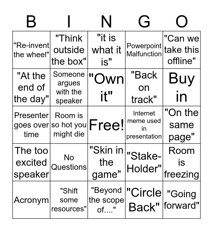 This bingo card has a free space and 34 words: Someone was late from Break, "Circle Back", Speaker Laughs at own joke, Sneeze, The too excited speaker, Someone argues with the speaker, "Can we take this offline", Acronym, "Think outside the box", "Ducks in a row", "Own it", "it is what it is", Someone falls asleep, Someone mentions weather, Internet meme used in presentation, Buy in, "Shift some resources", Presenter goes over time, No Questions, "Stake-Holder", "Skin in the game", Action Items, "Re-invent the wheel", "On the same page", "Beyond the scope of....", "Going forward", Powerpoint Malfunction, "Quick question", "Back on track", "At the end of the day", Someone is texting, Room is so hot you might die, Room is freezing and Awkward Silence.