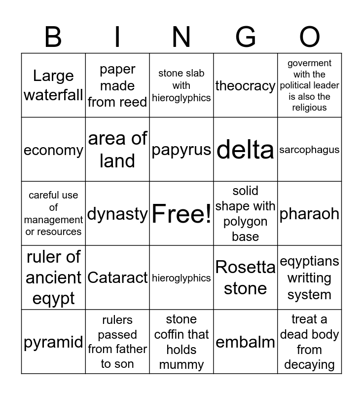 This bingo card has a free space and 24 words: Cataract, rulers passed from father to son, papyrus, pyramid, goverment with the political leader is also the religious, Large waterfall, economy, paper made from reed, solid shape with polygon base, hieroglyphics, delta, careful use of management or resources, Rosetta stone, eqyptians writting system, area of land, embalm, pharaoh, stone slab with hieroglyphics, sarcophagus, dynasty, treat a dead body from decaying, ruler of ancient eqypt, theocracy and stone coffin that holds mummy.