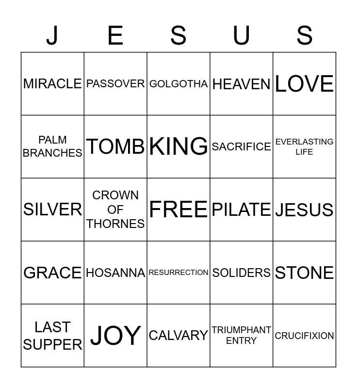 This bingo card has a free space and 24 words: HOSANNA, JOY, KING, LAST SUPPER, LOVE, MIRACLE, PALM BRANCHES, PASSOVER, PILATE, RESURRECTION, SACRIFICE, SILVER, SOLIDERS, STONE, TOMB, TRIUMPHANT ENTRY, JESUS, GOLGOTHA, EVERLASTING LIFE, CROWN OF THORNES, CRUCIFIXION, GRACE, HEAVEN and CALVARY.
