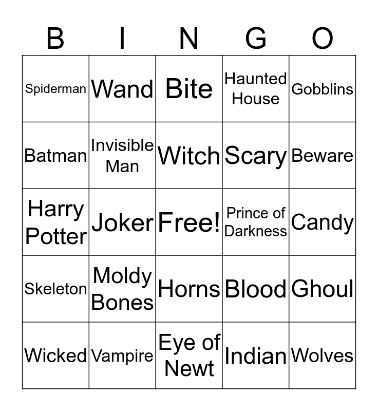 This bingo card has a free space and 64 words: Spider, Casper, Ghost, Ghoul, Monster, Princess, Wand, Magic, Witch, Broom, Horns, Ruby Red Slippers, Candy, Gobblins, Troll, Batman, Joker, Spiderman, Webs, Scary, Moldy Bones, Skeleton, Haunted House, Warlock, Pumpkins, Devil, Munchkins, Aladdin, Ariel, Graveyard, Grave Stone, Full Moon, Trick-or-Treat, All Hallows Eve, Beware, Wicked, Cowboy, Indian, Prince Charming, Invisible Man, Harry Potter, Prince of Darkness, Hocus Pocus, Toad, Howling, Wolves, Vampire, Fangs, Blood, Spells, Potions, Poison, Eye of Newt, Toe of Frog, Creepy, Crawling, Bite, Toil & Trouble, Bewitching, Foggy, Spooky, Treats, Tricks and Halloween.