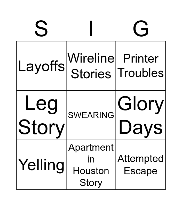 This bingo card has a free space and 8 words: Glory Days, Printer Troubles, Wireline Stories, Yelling, Layoffs, Attempted Escape, Leg Story and Apartment in Houston Story.