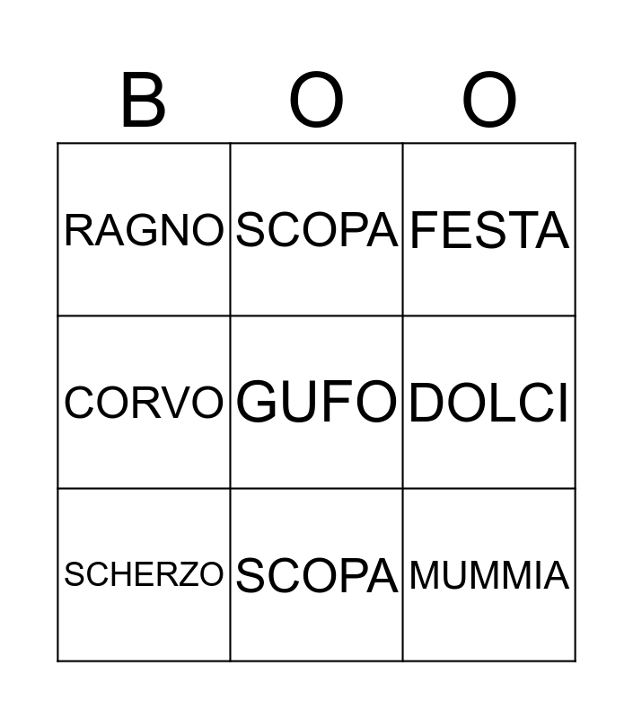 This bingo card has 13 words: FATA, MOSTRO, SCHERZO, SCOPA, CORVO, GUFO, MUMMIA, PAURA, SCOPA, RAGNO, DOLCI, FESTA and MOSTRO.