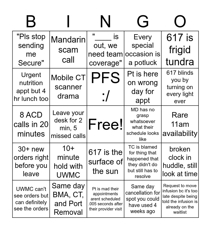 This bingo card has a free space and 24 words: 10+ minute hold with UWMC, Same day BMA, CT, and Port Removal, PFS :/, UWMC can't see orders but can definitely see the orders, 617 is frigid tundra, "Pls stop sending me Secure", Urgent nutrition appt but 4 hr lunch too, Mandarin scam call, MD has no grasp whatsoever what their schedule looks like, 617 is the surface of the sun, Pt is here on wrong day for appt, 8 ACD calls in 20 minutes, TC is blamed for thing that happened that they didn't do but still has to resolve, broken clock in huddle, still look at time, Mobile CT scanner drama, Same day cancellation for spot you could have used 4 weeks ago, Rare 11am availability, "____ is out, we need team coverage", 617 blinds you by turning on every light ever, Leave your desk for 2 min, 5 missed calls, Request to move infusion bc it's too late despite being told the infusion is already on the waitlist, 30+ new orders right before you leave, Every special occasion is a potluck and Pt is mad their appointments arent scheduled .005 seconds after their provider visit.