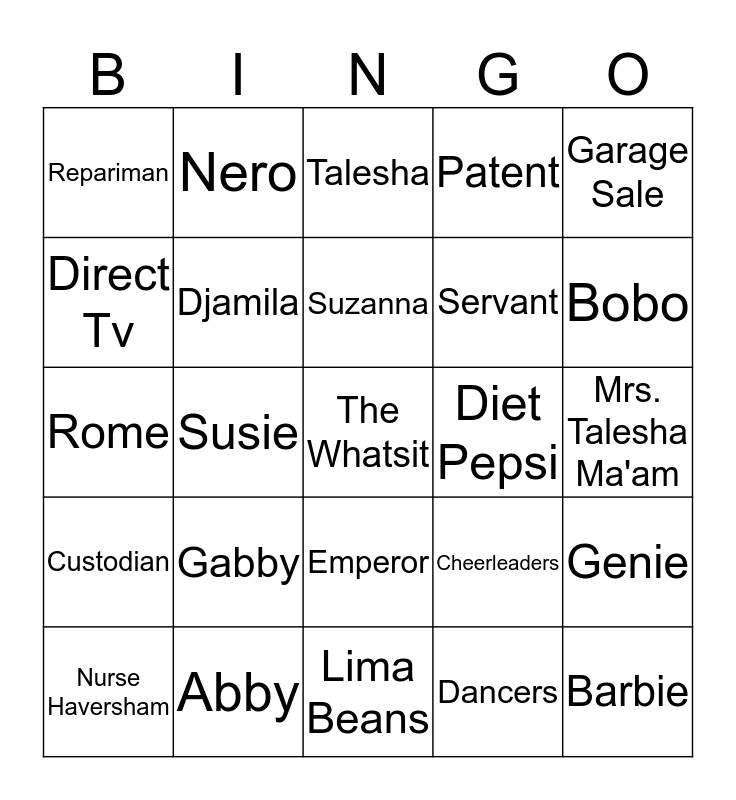 This bingo card has a free space and 24 words: Gabby, Abby, Suzanna, Nurse Haversham, Garage Sale, Repariman, Direct Tv, Nero, Diet Pepsi, Emperor, Servant, Rome, Cheerleaders, Genie, Djamila, Dancers, Mrs. Talesha Ma'am, Talesha, Bobo, Susie, Barbie, Custodian, Patent and Lima Beans.