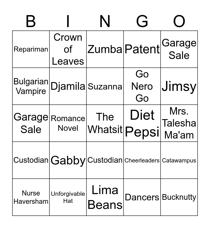 This bingo card has a free space and 24 words: Gabby, Unforgivable Hat, Suzanna, Nurse Haversham, Garage Sale, Repariman, Bulgarian Vampire, Crown of Leaves, Diet Pepsi, Custodian, Go Nero Go, Garage Sale, Cheerleaders, Catawampus, Djamila, Dancers, Mrs. Talesha Ma'am, Zumba, Jimsy, Romance Novel, Bucknutty, Custodian, Patent and Lima Beans.