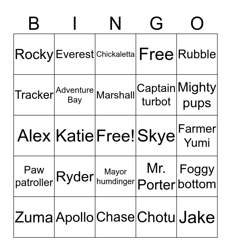 This bingo card has a free space and 25 words: Ryder, Chase, Marshall, Zuma, Rubble, Rocky, Tracker, Everest, Skye, Mayor humdinger, Captain turbot, Alex, Mr. Porter, Foggy bottom, Adventure Bay, Mayor Goodway, Farmer Yumi, Chickaletta, Mighty pups, Katie, Jake, Apollo, Paw patroller, Free and Chotu.
