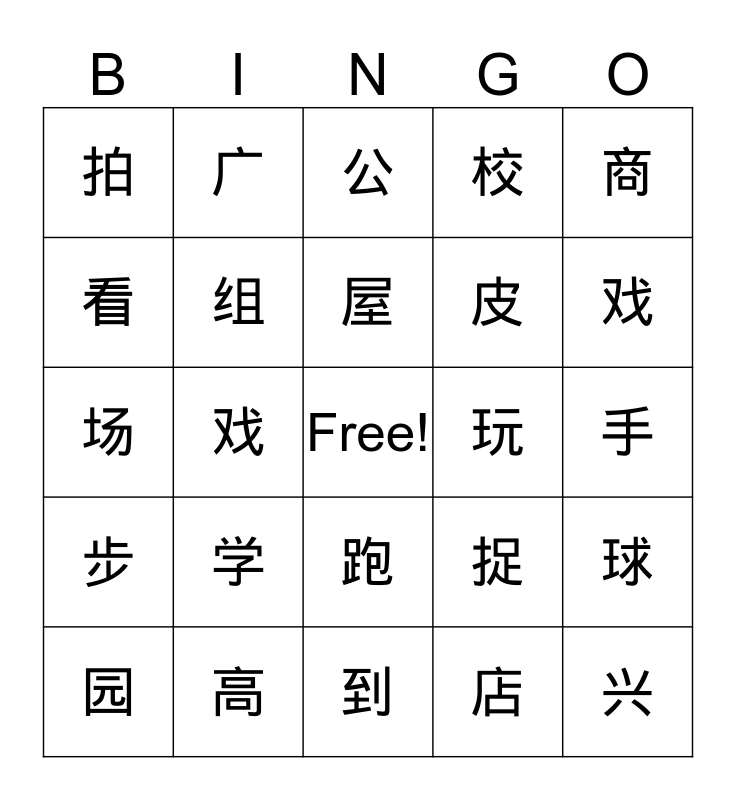 This bingo card has a free space and 24 words: 学, 高, 屋, 园, 商, 拍, 看, 广, 玩, 跑, 皮, 场, 捉, 球, 组, 店, 手, 公, 戏, 戏, 兴, 步, 校 and 到.