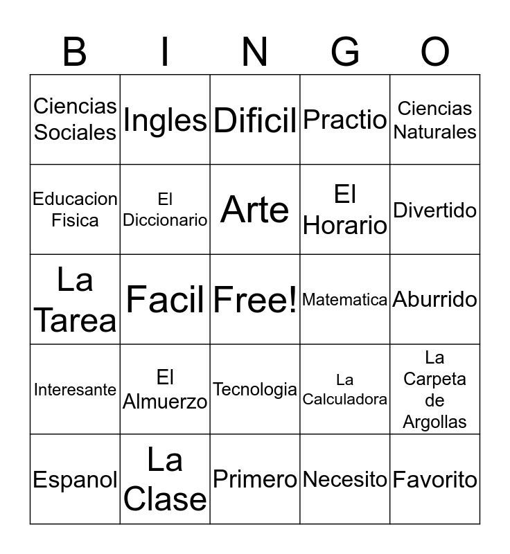 This bingo card has a free space and 24 words: El Almuerzo, La Clase, Arte, Espanol, Ciencias Naturales, Ciencias Sociales, Educacion Fisica, Ingles, Matematica, Tecnologia, El Horario, La Tarea, La Calculadora, La Carpeta de Argollas, El Diccionario, Necesito, Aburrido, Dificil, Divertido, Facil, Favorito, Interesante, Practio and Primero.