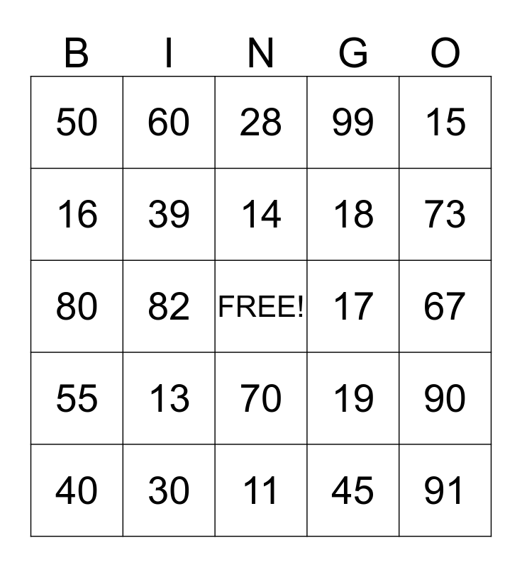 This bingo card has a free space and 24 words: 13, 30, 14, 40, 15, 50, 16, 60, 17, 70, 18, 80, 19, 90, 39, 45, 67, 28, 73, 82, 91, 55, 99 and 11.