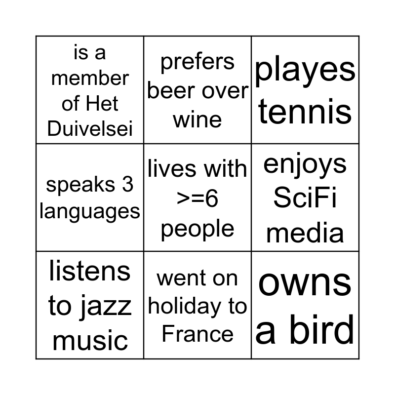 This bingo card has 9 words: listens to jazz music, playes tennis, prefers beer over wine, speaks 3 languages, is a member of Het Duivelsei, enjoys SciFi media, lives with >=6 people, owns a bird and went on holiday to France.
