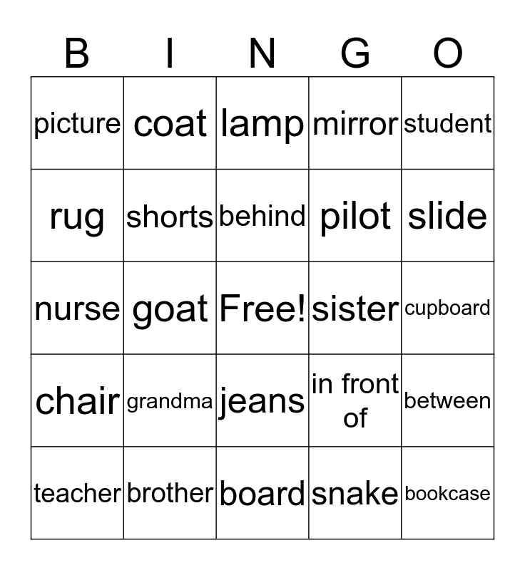 This bingo card has a free space and 29 words: teacher, trousers, goat, duck, picture, lamp, shorts, grandma, sister, brother, cupboard, bookcase, board, snake, slide, swing, jeans, chair, student, nurse, in front of, see saw, pilot, rug, mirror, coat, between, behind and sofa.