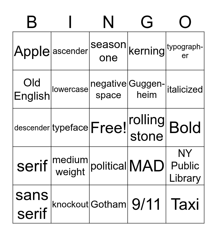 This bingo card has a free space and 29 words: sans serif, Papyrus, typeface, watch, Apple, season one, lowercase, medium weight, rolling stone, knockout, Bold, Taxi, Gotham, 9/11, italicized, stroke, political, serif, typograph-er, descender, MAD, Decimal, Guggen-heim, Old English, kerning, ascender, NY Public Library, negative space and Paula Scher.