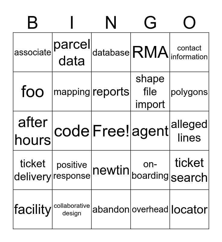 This bingo card has a free space and 29 words: facility, member, code, design, associate, database, mapping, positive response, agent, collaborative design, alleged lines, locator, abandon, overhead, polygons, PA-174, newtin, ticket delivery, contact information, after hours, on-boarding, overhead, shape file import, foo, RMA, parcel data, ticket search, reports and services.