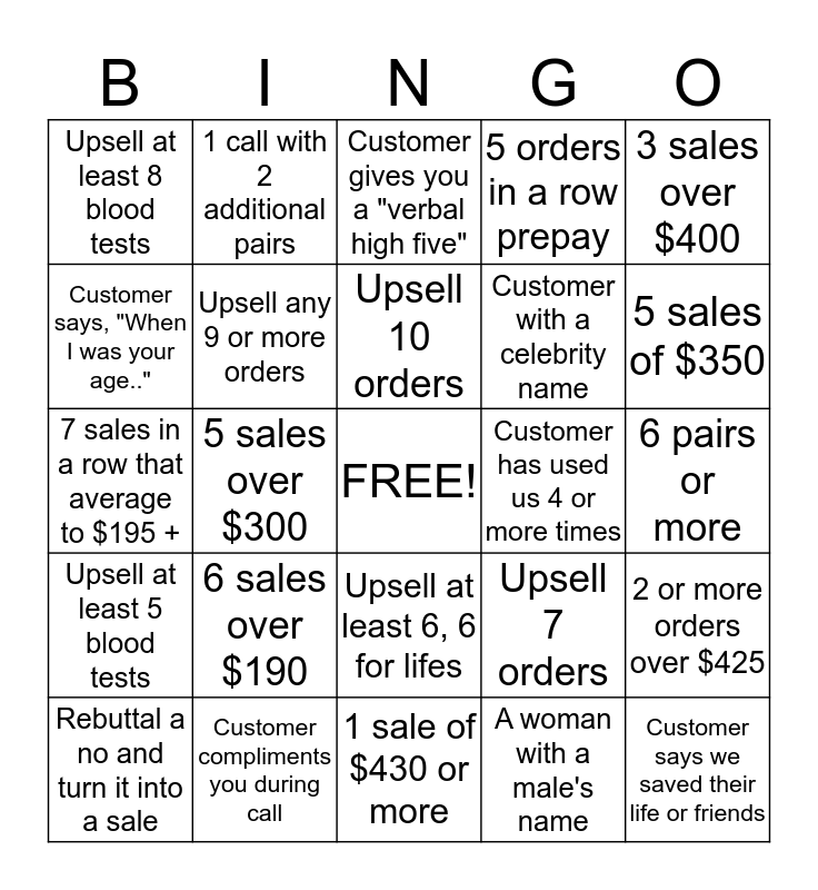 This bingo card has a free space and 24 words: 6 sales over $190, Customer compliments you during call, Upsell 10 orders, Rebuttal a no and turn it into a sale, 3 sales over $400, Upsell at least 8 blood tests, Customer says, "When I was your age..", 1 call with 2 additional pairs, Customer has used us 4 or more times, Upsell at least 6, 6 for lifes, Customer with a celebrity name, 7 sales in a row that average to $195 +, Upsell 7 orders, 2 or more orders over $425, Upsell any 9 or more orders, A woman with a male's name, 6 pairs or more, Customer gives you a "verbal high five", 5 sales of $350, 5 sales over $300, Customer says we saved their life or friends, Upsell at least 5 blood tests, 5 orders in a row prepay and 1 sale of $430 or more.