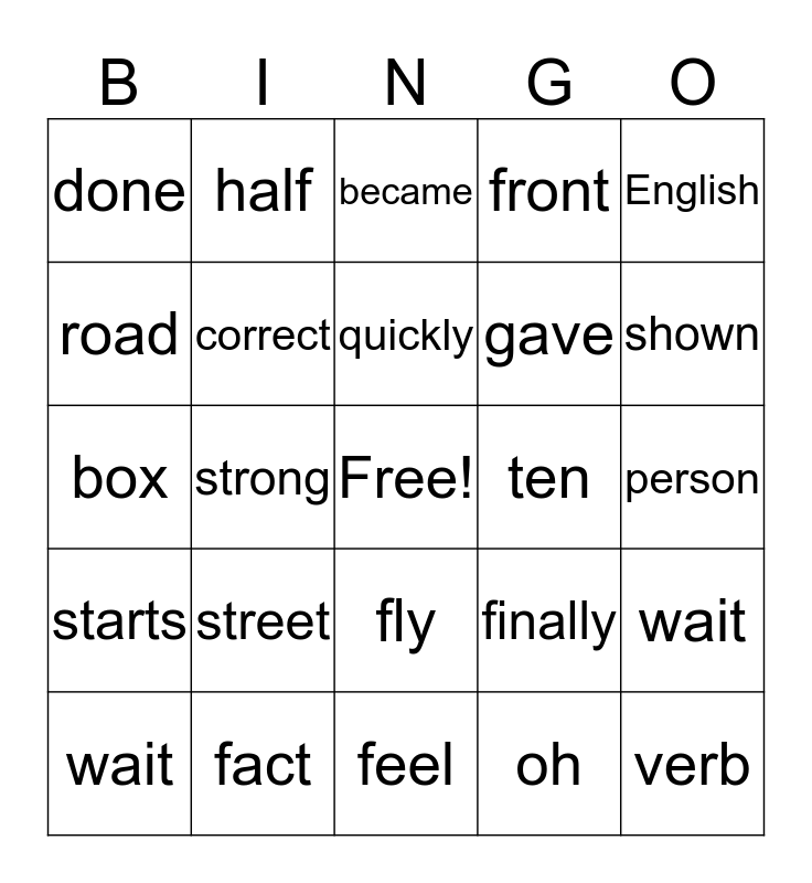 This bingo card has a free space and 24 words: street, fact, quickly, wait, English, done, road, half, ten, fly, gave, box, finally, wait, correct, oh, person, became, shown, strong, verb, starts, front and feel.