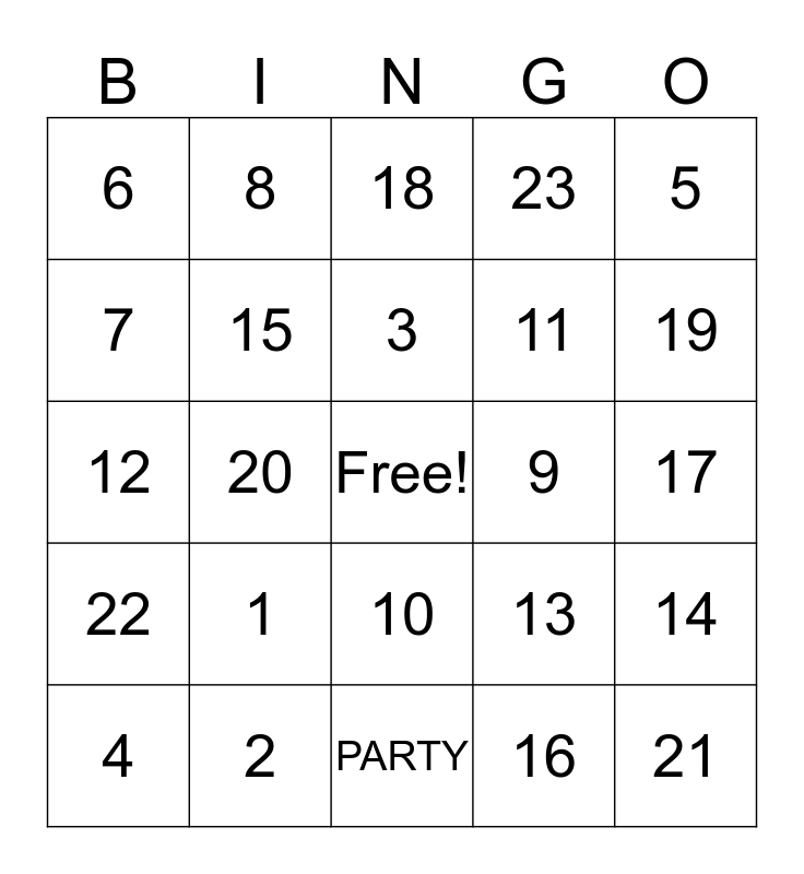 This bingo card has a free space and 24 words: 1, 2, 3, 4, 5, 6, 7, 8, 9, 10, 11, 12, 13, 14, 15, 16, 17, 18, 19, 20, 21, 22, 23 and PARTY.