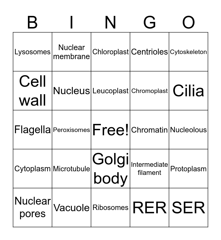 This bingo card has a free space and 28 words: Protoplasm, Cytosol, Chromoplast, RER, Cell wall, Chloroplast, Nuclear membrane, Cytoplasm, Chromatin, Nuclear pores, Flagella, Centrioles, Vacuole, Ribosomes, Cilia, Microfilament, Microtubule, Nucleus, Leucoplast, Golgi body, Lysosomes, Mitochondria, SER, Peroxisomes, Nucleolous, Intermediate filament, Cytoskeleton and Plasma membrane.