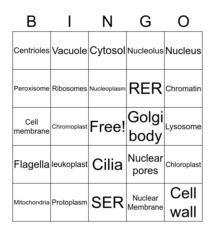 This bingo card has a free space and 24 words: leukoplast, Protoplasm, Nucleoplasm, Mitochondria, Nucleus, Centrioles, Peroxisome, Vacuole, Golgi body, Cilia, RER, Cell membrane, Nuclear pores, Chloroplast, Ribosomes, Nuclear Membrane, Lysosome, Cytosol, Chromatin, Chromoplast, Cell wall, Flagella, Nucleolus and SER.