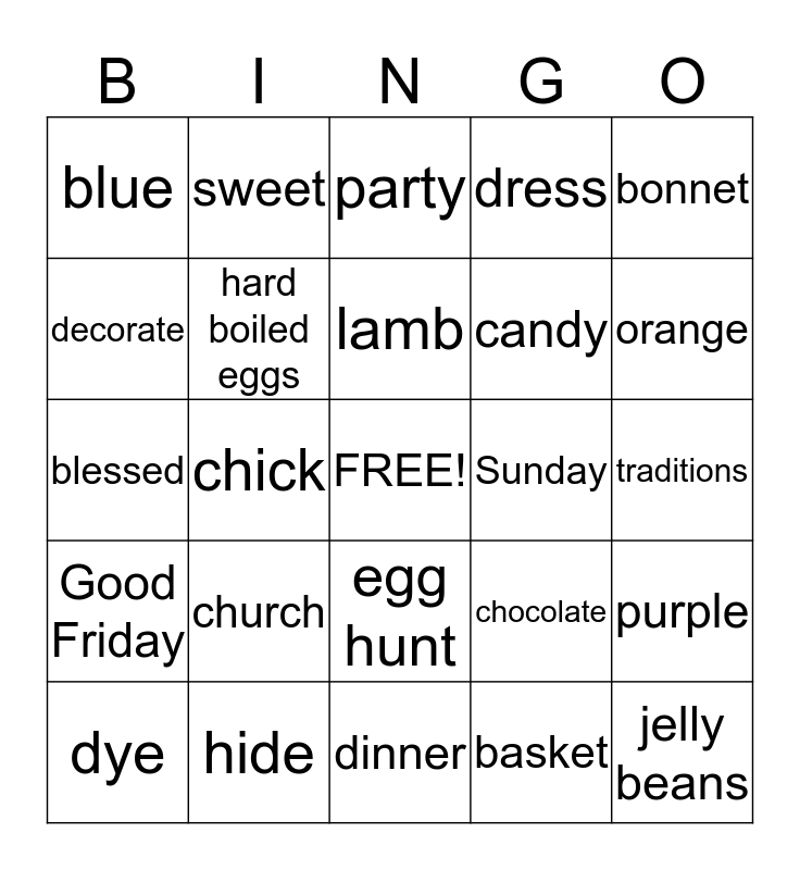 This bingo card has a free space and 24 words: church, hide, lamb, dye, bonnet, blue, decorate, sweet, Sunday, egg hunt, candy, blessed, chocolate, purple, hard boiled eggs, basket, traditions, party, orange, chick, jelly beans, Good Friday, dress and dinner.