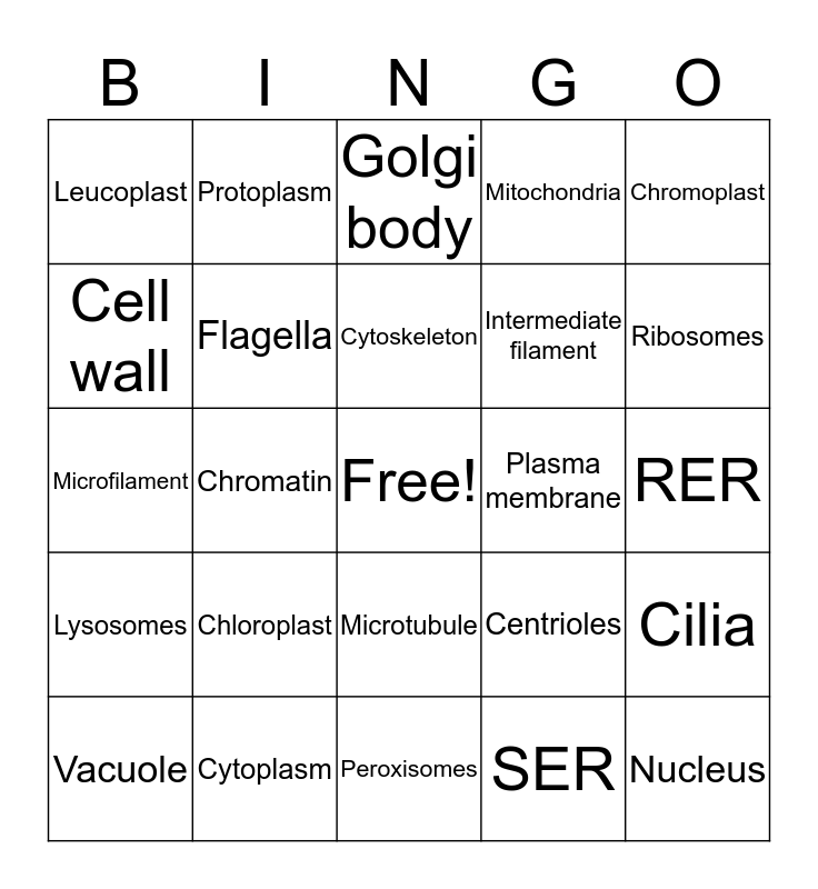 This bingo card has a free space and 24 words: Chloroplast, Cytoplasm, Cytoskeleton, Vacuole, Chromoplast, Leucoplast, Cell wall, Protoplasm, Plasma membrane, Microtubule, Intermediate filament, Microfilament, Centrioles, Cilia, Flagella, SER, RER, Golgi body, Ribosomes, Chromatin, Nucleus, Lysosomes, Mitochondria and Peroxisomes.